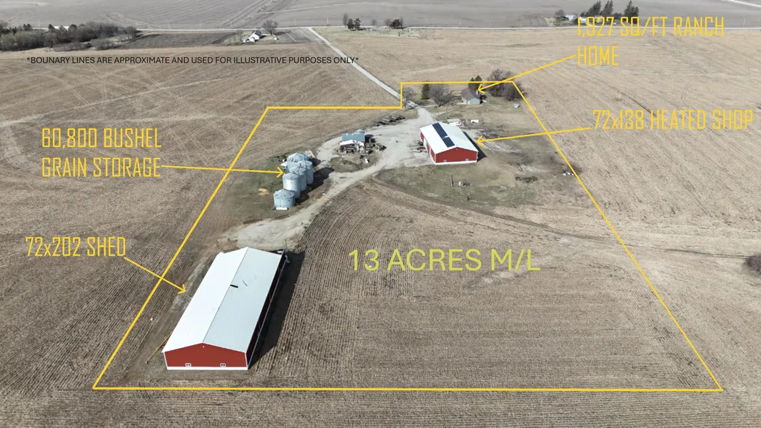 At the heart of this property is a large, heated 72x138 Morton Building with guest quarters. The shop has modern 24.6 KW solar panels that help reduce energy costs. There is 60,800 bushels of grain storage on the property, highlighted by a 13,800 bushel bin with a Shivers dry flow system. There is also a 28x42 crib that can be used for storage. There is also a 72x202 Morton Building that is usable but has sustained storm damage that can be easily repaired.
