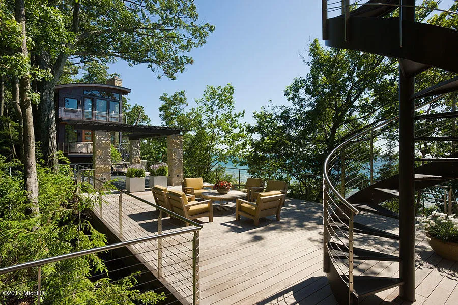 This contemporary Lake Michigan estate offers an unparalleled and sophisticated design inspired by its natural surroundings with vaulted ceilings, floor to ceiling windows, stone fireplaces, rooftop decks and panoramic forest and lake views. Perfect for entertaining friends and family the home's sprawling deck with swim spa and outdoor dining areas tastefully joins three separate living quarters with over 8,000 sq. ft. of living space. Nestled atop a dune overlooking Lake Michigan, the undisturbed 25+ acres of private forest and lakeshore provide the ultimate private retreat. The tranquil stretch of 576 feet of beach is perfect to enjoy long summer days of swimming, boating and beach activities. The main home also features a fitness facility, sauna and steam room, and a wine grotto.