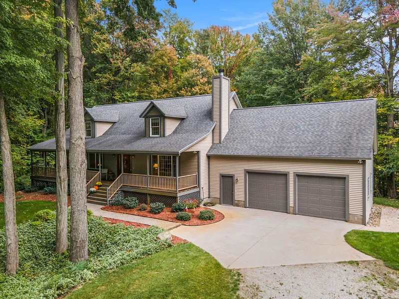 Enjoy your own private retreat, nestled on 15 wooded acres with 5 bedroom, 3.5 baths in Fruitport Twp. Open concept main floor living with lots of light and nature views from all windows. Finished lower level walk out with bar and family room perfect for entertaining. Home features a large deck off the kitchen, a large front porch w/pond view. Oversized outbuilding w/finished upper level. Home Generator, all appliances Must see this quality built home.