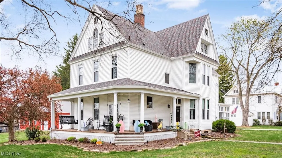 Timeless charm meets modern convenience in this beautifully maintained Victorian-style home, situated on a spacious corner lot of over an acre within city limits. A gorgeous, wraparound porch welcomes you to this three-story gem, which blends classic character with thoughtful updates throughout.The home features a large eat-in kitchen, formal dining room, living room, family room, office, and a full bath on the main level. Upstairs, the second floor offers four oversized bedrooms, a full bath, and convenient second-floor laundry. The third level includes two additional bedrooms, a sitting room, and another full bath.Outside, you'll find an oversized detached garage with space for four or more vehicles, plus a new 40x40 garage with 12-foot overhead doors, water, and electric. Recent updates include a newer roof, siding, and windows (approximately 3 years old), as well as a furnace (within the last 6 7 years) and updated electrical.This home is a true standout with curb appeal, character, and space right in the heart of the city!