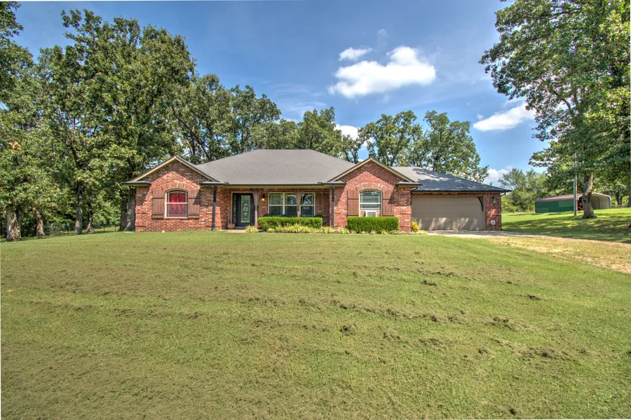5 acre parklike setting and an all brick home. 3 bed, 2 baths, granite counters throughout. Marble backsplash. Kitchen remodeled in 2019. Updated paint and flooring. Modern In-ground storm shelter seats 12. Storage shed. Move in Ready.