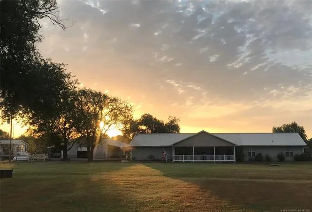 LISTING AT 12/22/2022 appraised value! Two houses totaling 3816 sq ft m/l! MAIN HOUSE (2226sqft m/l): Ranch-style open concept home w/ceiling fans throughout. Carpeted great room w/alcove office area wired for fiber optic internet. Electric-heating fireplace that can be converted back to propane. Brick-floored kitchen & dining w/bar seating & granite countertops. Brick floors in half-bath & laundry room. Laundry room includes built-in utility closet & pantry. Carpeted large master bedroom w/propane-heating fireplace. Customed tiled master bath w/double sinks & marble countertops, large glass-blocked & tiled walk-in shower, and a large Jacuzzi tub. Custom large walk-in closet off master bath. Second & third bedrooms are tiled & can fit a King-Size Bed. 3/4 Hall Bath. Front covered porch w/swing. Uncovered back patio can be entered from great room & master bedroom. Two-car attached garage w/attic access. STORM SHELTER, fire pit & pergola also included. IN-LAW/GUEST HOUSE (1590sqft m/l): Fully electric 2007 manufactured home. Custom-built covered porch. Three bedroom, 2 bath w/original carpet & vinyl flooring. An amazing kitchen w/large center island. Includes refrigerator, dish washer, & stove. Living has a wood-burning fireplace. Split bedroom plan. Large master bedroom. Master bath has separate shower & jetted tub, double sinks, & walk-in closet. Laundry room can accommodate full-size washer & dryer & exits to back of the house. Updated 2017-18 w/new: pex plumbing, ceiling fans, lighting fixtures, bathroom & kitchen fixtures. New Metal Roof in July 2022. BARN: Large metal barn w/electric & water. Includes storage/tack room, workshop, washing bay, open storage area, with (4) stall doors on southside w/lean-to. Carport for in-law/guest house. Additional Info: Property includes pond, barbed-wire fencing, front white pipe-railed paddock w/lean-to; & garden shed.