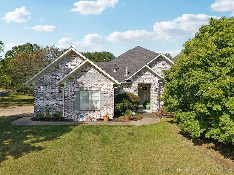 This beautiful full-brick home has three bedrooms and two and a half bathrooms, and is situated on 2.55 wooded acres with a creek. Features include a side-entry three-car garage, ceilings exceeding twelve feet, and abundant natural light. The kitchen is equipped with granite countertops, double ovens, a six-burner gas cooktop, a pot filler, a pasta drying rack, a spacious pantry, a center island, a pull-out drawer for a mixer, a newer dishwasher, and a newer refrigerator. The breakfast area includes a window seat. Additional amenities include a large laundry room with a countertop, a living room with a dual gas burning fireplace and French doors that open to the covered patio, an office or den, new ceiling fans, and extensive storage space. Make this your new home.