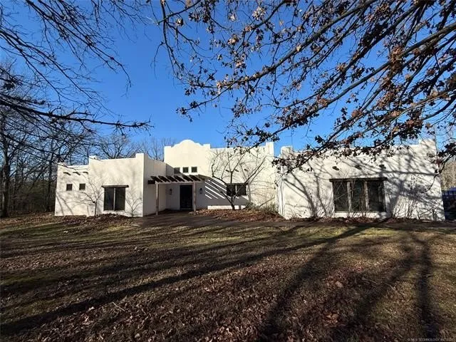 Hascienda Style home setting on apx 55 wooded acres. This property is very private and allows you to enjoy the great outdoors and it's wildlife. The home features 3 fireplaces, 2 inside and 1 outside, there is a great room and a den. The home is set-up like a true mother-in-law floor plan with a separate entrance. The saferoom is in the garage with easy access.