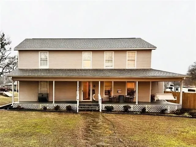 Country estate on approximately 10 acres (more or less) with mature trees, rolling terrain, and a peaceful, private setting. The main residence offers four bedrooms, multiple living areas, and recent upgrades including tile in the primary bathroom and closet, a new toilet, updated/added propane lines to kitchen, and a new propane/gas oven-range. A privacy-fenced dog run with dog door adds thoughtful convenience for pet owners. Also featuring a newly built shop converted living space provides additional space with commercial-grade steel stud construction throughout, insulation, covered back porch viewing the beautiful land, its own breaker panel, tankless water heater, and a fully fenced private side yard with dog door access as well—ideal for guests, extended family, or executive-style accommodations. The property also features a tiny home with two rooms, three spacious lofts, and a full bathroom currently being updated with new tile flooring, vanity, toilet, and shower. The kitchen includes new cabinetry, butcher block countertops, and sink. Two RV hookups—one at the barndo house and one at the barn—add flexibility for visitors and travel convenience. Conveniently located approximately 25 minutes to Muskogee, Eufaula, Bixby, and Broken Arrow, 20 minutes to Coweta, and about 35 minutes to Tulsa. Close to lakes, hiking, outdoor recreation, and VA facilities in Muskogee and Tulsa. Positioned in a growing area with strong future upside. Photography is scheduled and will be added soon; current photos are temporary.