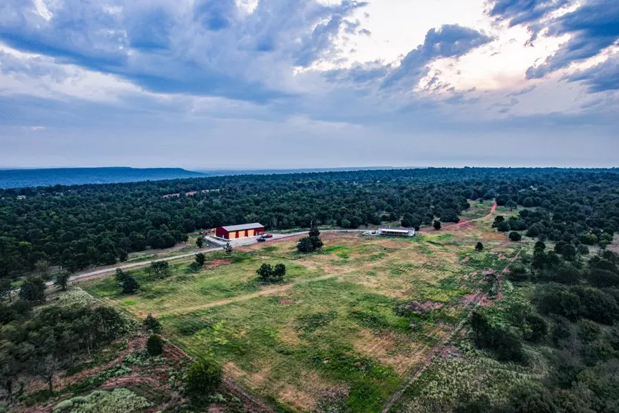 A short drive off the pavement leads you directly to the large gated entry of this secluded mountain property known as Burn Mountain Ranch. Just inside you will come upon a brand new, fully-insulated 5,000 square foot shop with 4 overhead doors and office space. The shop also offers 2 HVAC units and a third in the office. A full bathroom with a toilet and shower, as well as a plumbed ice maker, shop sink, and washer/dryer hookups. This area easily could be converted to a second living space or converted to a full-blown barndominium. Adjacent to the shop is a 2,200 square foot modular home less than a year old, boasting a 16'x73' covered porch overlooking the 5 acre trap. Relax on your porch and soak up some of God's greatest sunsets he paints in Oklahoma.