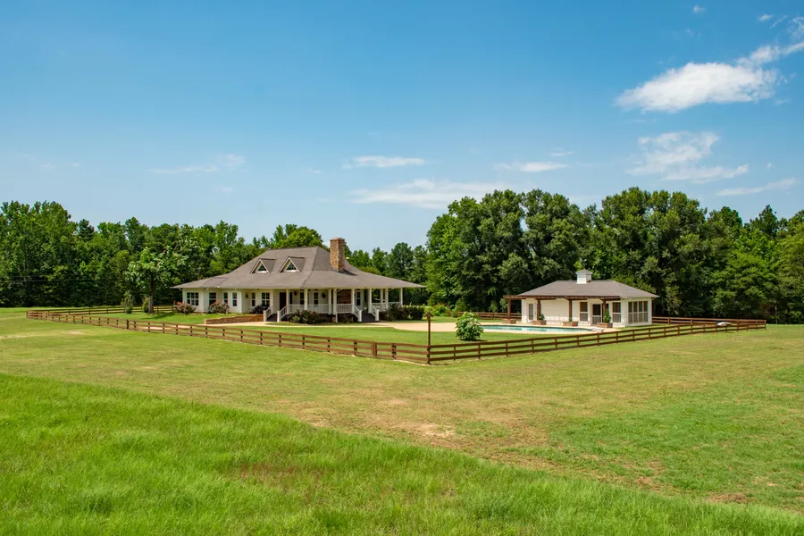 Graceful southern architecture and picturesque views give this gorgeous East Texas home and guest house its charming appeal. Red Gate Farm sits on a hilltop at an elevation of 390 and boasts panoramic views of 42 acres of highly productive pastureland with improved Bermuda grass and mature wooded timber. The homes exclusive award-winning design by Historical Concepts for Southern Living offers deep sheltering overhangs and expansive wrap around porch with wood burning fireplace, providing comfortable spaces for entertaining and relaxation along with spectacularsunrise and sunset vistas. The interior of the with natural light through dormer triangular windows, french doors, and overhead transoms, allowing sunlight to pour through into the space. Custom Hunter Douglas blinds of natural grass and bamboo combine with solid brass barley twist hardware, bespoke lighting fixtures, and a unique 1820s hand-etched glass transom lend elegance of the homes spaces. The free-standing kitchen in this homes open floor plan is architecturally positioned to provide an uninterrupted field of vision to the living room and breakfast area and its large, walk-in butlers pantry offering abundant kitchen storage. Each of the homes three bedrooms boast a full ensuite bath, custom hardware and fixtures, over-sized walk-in closets, and a private office adjacent to the primary bedroom. A large attic space is a bonus for extra storage. The gracious porch of the homes steps down to the pool area with a large entertainment patio, fully-screened pool house with outdoor shower, half bath, and over-sized storage room.