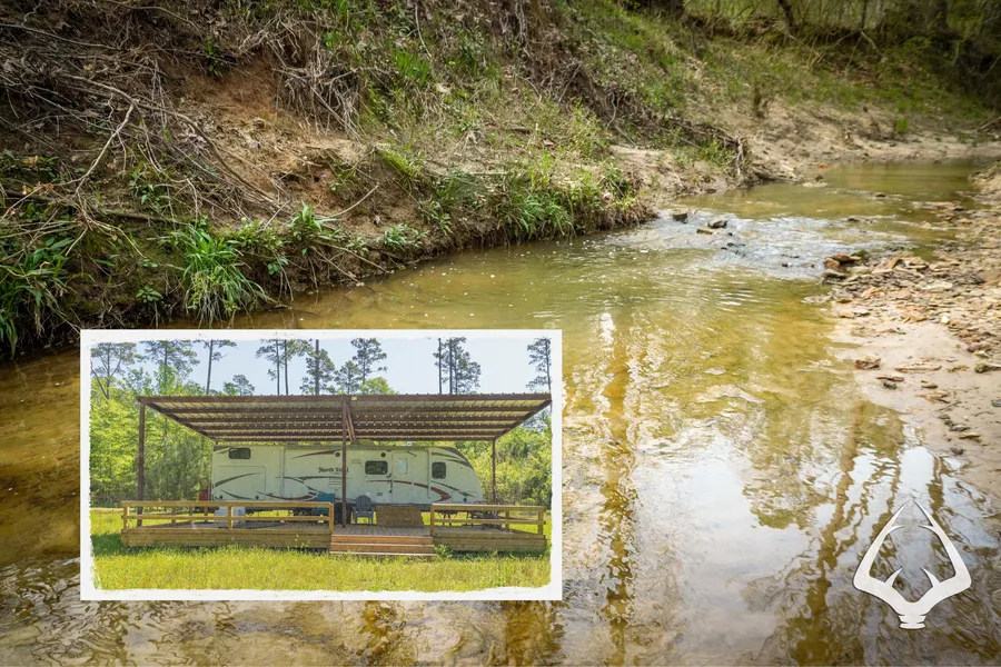 The property has been improved in mindful way. The RV campsite in the front boast full perimeter fencing, rocked entry road, new metal RV covering, new decking, and more! The deer stands are built to last (one of them being tree-house style!), and have been positioned in natural game corridors along the creek. A nice underbrushed lounge area (with a small deck spot and chairs has been cleared directly off the creek, creating a peaceful and serene setting.