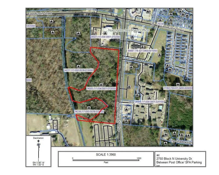 Research Parcel InformationFrom Intersection of University Drive/Austin Street in Nacogdoches Texas. Go South 1 block Tract lies to the West Side of University Drive.