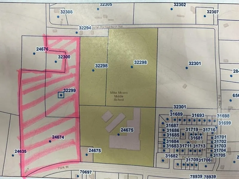 19 +/- acres on Park Street next to Mike Moses School. Level acreage to build with some marketable timber. Zoned General Business