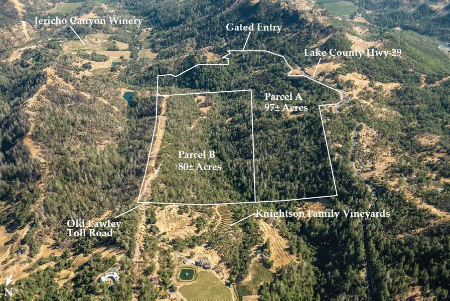 TAG Ranch is located at the north end of Napa Valley, with gated entry from Lake County Highway 29. Knighton Family Vineyard is adjacent to the northern boundary and Jericho Canyon Winery is near the southeast boundary. The ranch has been used historically for grazing and does not have any improvements. There are two legal lots of record 97 acre Parcel A and 80 acre Parcel B. According to Napa County Planning Department, each parcel can accommodate a home.