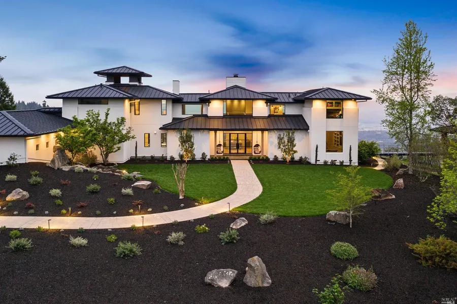 A luxurious modern farmhouse estate on a private 15.2 +/- acre parcel with unobstructed Napa Valley views of Mt. Diablo and Mt. Tamalpais. Surrounded by rolling hills and park-like landscapes of neighboring lands, this family-centric property offers ample entertainment possibilities enhanced by a highly-curated personal touch reflected even its most subtle features. Charming Angwin is one mile from this awe-inducing estate and an easy 15-minute journey to renowned St Helena. Remodeled in 2020, the 6,000 +/- sq ft main residence has 4 bedrooms, 4 bathrooms, 1 half bath, and a private 1 bed/1 bath full guest unit. Tall ceilings, minimalist-inspired design, and floor-to-ceiling windows creates a calming atmosphere apparent from the threshold.