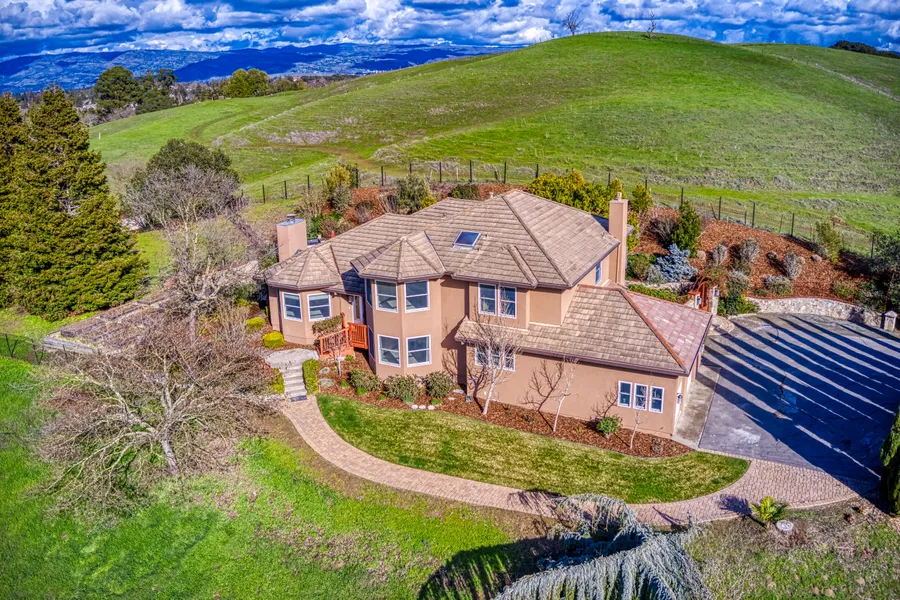 Up a private drive, sitting on 3.24 acres, this home features five bedrooms and three full baths. A full outdoor kitchen, extensive patio areas, raised beds for veggies. Plenty of room for a pool, possible ADU. Inside, the kitchen features extensive drawers/cabinets with pullouts, Viking appliances, including a double oven, microwave, refrigerator, gas cooktop and pot filler for added convenience. Copper sink, gorgeous granite countertops. The family room, with wet bar and fireplace, adjoins the kitchen. Full bedroom and bath on the main level. Generous sized laundry room with sink, many cabinets. Additionally, pantry/storage room with cabinets galore. Primary bedroom has vineyard views and a balcony, oversized dressing/bath room with plentiful closets. In the garage there is a tool/hobby room