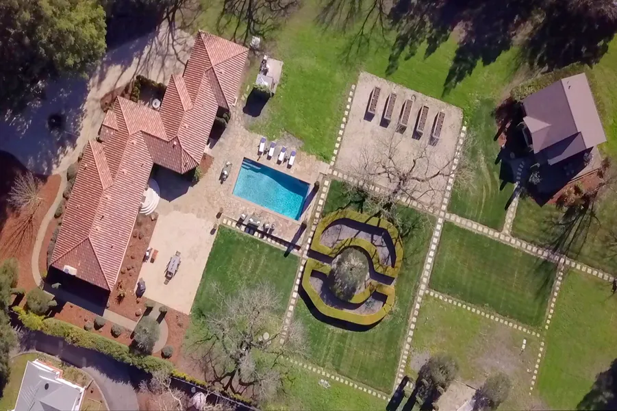 Napa Valley resort-like compound located in private gated setting on Napa's coveted east side in the Coombsville AVA minutes to downtown. Single level 2843+/- sqft. 3 bedroom, 3 bath main house offers spacious primary suite with fireplace and private deck with views of the stunning grounds, gourmet kitchen with Carrera marble center island, Wolf 5 burner cooktop, and informal dining area, generously proportioned formal dining room and large family room - all with French doors opening to multiple outdoor entertaining areas and gas heated pool. Located at the rear of the property for privacy is a guest house offering 1 bedroom, 1 bath 900+/- sqft. studio style with large walk-in closet perfect for guests, office and/or exercise studio and featuring it's own private deck. Gorgeous expansive park-like grounds with raised garden beds, Italian cypress, black walnut, olive, satsuma orange and lemon trees along with ample room for a gentleman's vineyard, bocce and other outdoor activities.