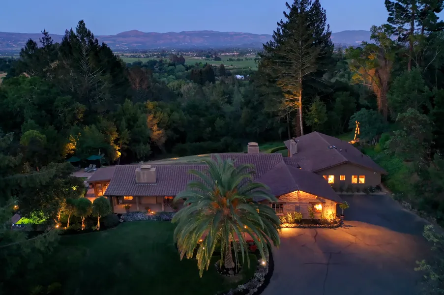 Classic California adobe style ranch property with stunning views located in private gated setting in Dry Creek corridor of north Napa minutes to Yountville and downtown Napa. Gorgeous park-like grounds with extraordinary single level home offers quintessential hacienda style with deep front porch, redwood ceilings with exposed beams, custom made doors and redwood accented windows. Great room with exceptional views of Valley Floor and eastern hills features gas fireplace, built-in bookshelves and French doors that open to spacious screened in porch with views of the 50' heated pool. Country kitchen offers gas cooktop with copper hood, double ovens, subzero, butcher block countertops, informal dining area and amazing views from kitchen sink. Custom door opens to expansive outdoor dining area with spectacular views. Formal dining room with bay window and temperature controlled wine closet. Romantic main en-suite with fireplace features French doors that open to private patio and spa-like bath all with views!