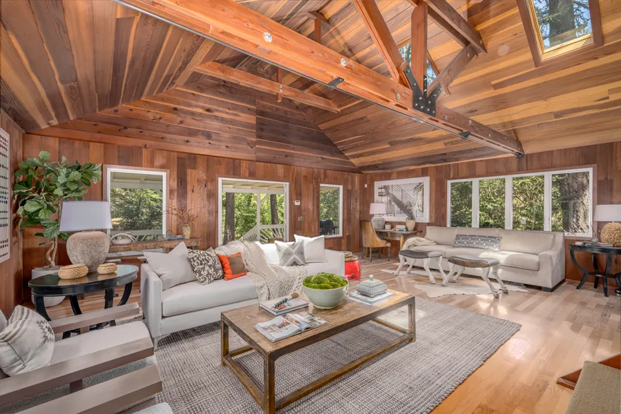 On the other end of the property and at a higher elevation and out of sight of the existing home is a phenomenal private 20 acre build site situated on an oak-studded knoll with 360* views of Mount St. Helena and the Mayacamas Mountains, with its own (new) 50 gpm well and plans for a 3-bedroom County-approved septic. A separate entrance maintains complete privacy from the existing structure. Add your own vineyard or barn, or both! This property benefits from having a Calistoga address, yet it sits just inside the Sonoma County line and a legal vacation rental area. The existing home is currently a highly sought after vacation rental, generating approximately $80k annually and the property is eligible for new license with the new owner. Located just just about 6 miles to Calistoga.