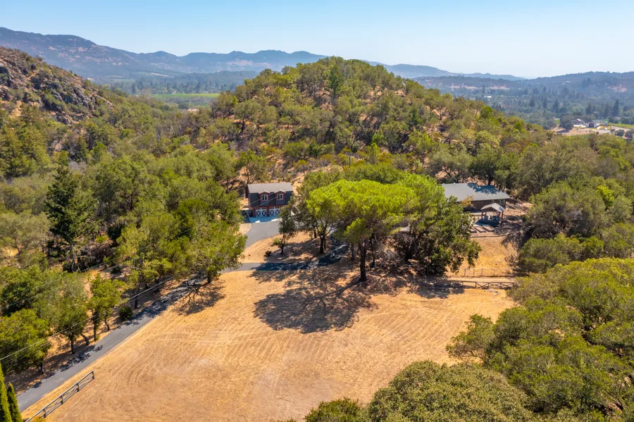 Napa Valley retreat featuring single level main house on 5 acres with city water located on East side of Napa minutes to downtown. Private and serene setting sited amongst an enclave of custom homes with pasture area perfect for horses, farm to table garden or orchard. 2540 square foot main house with 4 bedrooms 3 baths including 3 ensuites with spa-like main ensuite bath, spacious family room with exposed beam wood shiplap ceilings, fireplace, custom built-ins and abundance of dual pane windows that showcase the beautiful grounds and outdoor entertaining areas including a loggia currently purposed as covered outdoor dining, expansive patio and gazebo. 1122 square foot detached 2-car garage featuring bonus room on 2nd level currently an exercise studio and suitable for an office. 581 square foot 2nd unit perfect as a wine cellar or with renovation would make a fabulous artist retreat or guest house. Additional features: central air and heat, owned solar system and attached stone-clad carport with temperature-controlled storage.