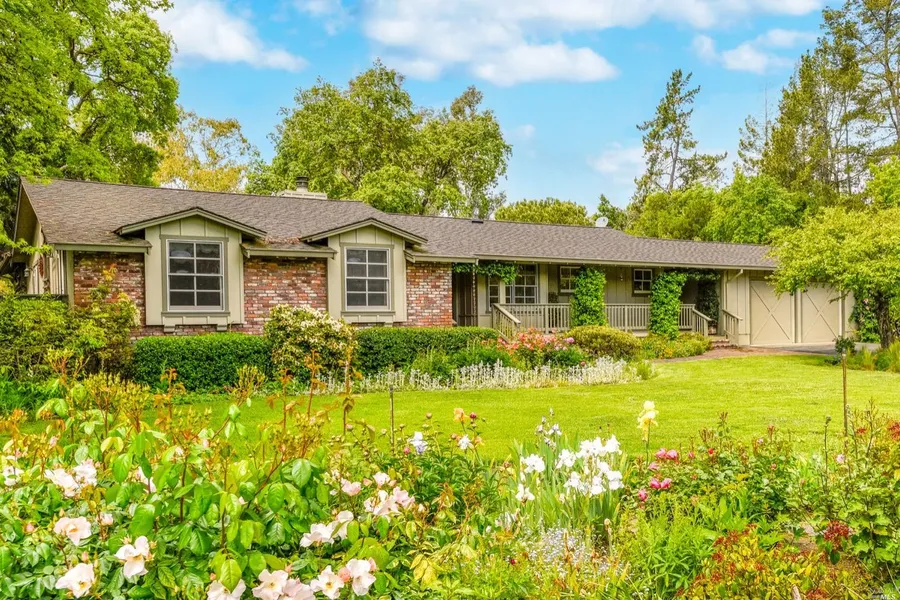 This is the Napa Valley setting you've been waiting for. Located on a private 4.7+/- level, usable acres, this desirable flag lot with paved access and circular drive has a charming 2,394+/- sqft 4 bedroom, 2 bath single-level home with endless possibilities. Vaulted ceilings with exposed beams and french doors give a sense of space. Living room with lovely stone fireplace with adjoining formal dining room adds charm to this unique offering. Well equipped galley kitchen with window seat looking out to covered front porch, lush landscape and adjacent vineyards. There are three guest bedrooms and a fourth oversized bedroom with vaulted ceilings, views of grounds which lends itself to a possible art studio, home office, or master suite. There are two full baths as well as an indoor laundry room. rear deck area is great for entertaining and has views of the lush rear garden with extensive plantings and mature trees. There is a covered attached breezeway with access to oversized two car garage. Seasonal creek, borders the rear of the property. Central heat/air. Minutes to downtown Napa, Yountville and more.