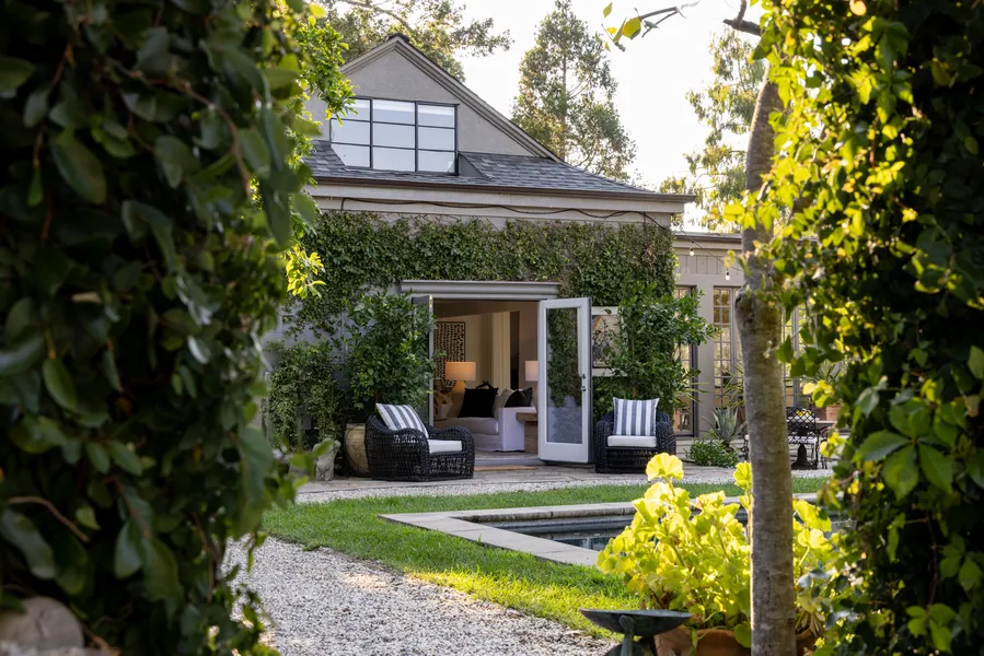 The guest cottage adds an additional 565+/- square feet and offers a welcoming and private retreat for visitors. It includes a spacious bedroom, a full bathroom, a well-appointed kitchen, and a comfortable living area that opens directly to one end of the pool, providing a seamless connection to the outdoors. A 500+/- square-foot artist studio thoughtfully located away from the main and guest houses offers a serene and inspiring environment for creative endeavors or quiet contemplation.