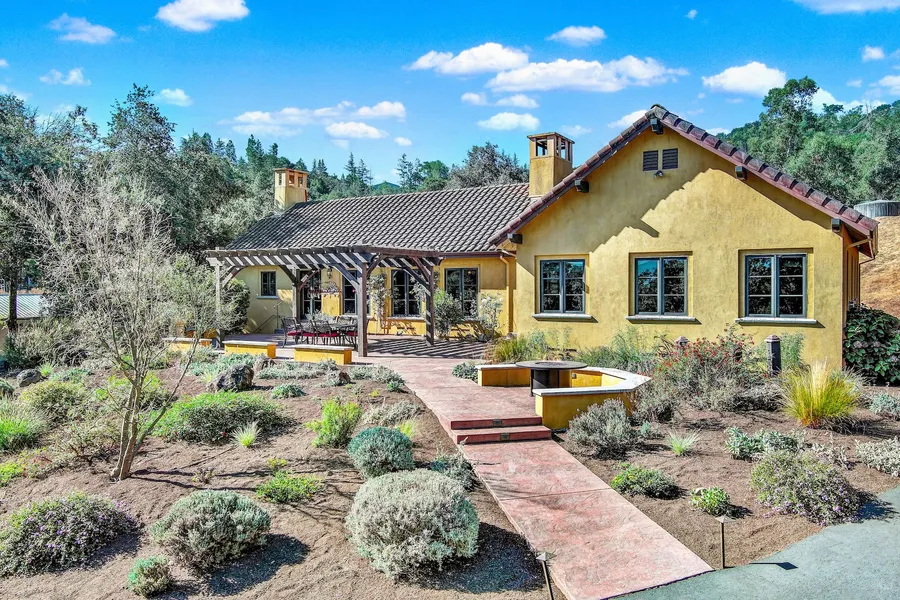 Step into elegance with this stunning single-level Mediterranean-inspired home, nestled on 2.47 picturesque acres. Appealingly close to town, this gated property offers privacy and breathtaking views, combining luxurious comfort with serene natural beauty. Enjoy spacious living areas, exquisite custom architectural details, and outdoor spaces perfect for entertaining. Embrace the tranquil Napa Valley lifestyle in a home where every day feels like a vacation. In addition to the custom residence, a single-level rustic 1,200 square foot guest cottage is currently tenant-occupied. The main residence features a spacious open-concept great room that seamlessly connects to a well-appointed kitchen. The kitchen boasts a generous island and a separate butler pantry with loads of storage and prep space. The home includes three comfortable bedrooms including the elegant primary suite enhanced by the vaulted beamed ceiling and conveniently located office with custom dual desks.
