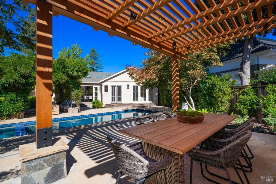 On St. Helena's west side enclave sits a charming 1362 sq ft. craftsman cottage in the warm and friendly neighborhood on Stockton Avenue. Renovated with exquisite taste and lovingly maintained, you'll immediately feel welcome. The cozy entryway opens to the great room with beautiful natural light, vaulted beadboard ceiling adorned with skylights, wide plank European Oak floors, wood-burning fireplace, and a spacious dining area. The living and dining area opens graciously to the custom, redesigned kitchen with beautiful finishes: granite counters, polished nickel fixtures, Wolf Range, Subzero built-in appliances, and access to the backyard. Three bedrooms and two updated bedrooms complete the main home. The tranquil backyard centers around the heated 10'x32' pool with an integrated spa, two lighted trellised areas - one for dining and one with a custom fire feature and seating area for y...