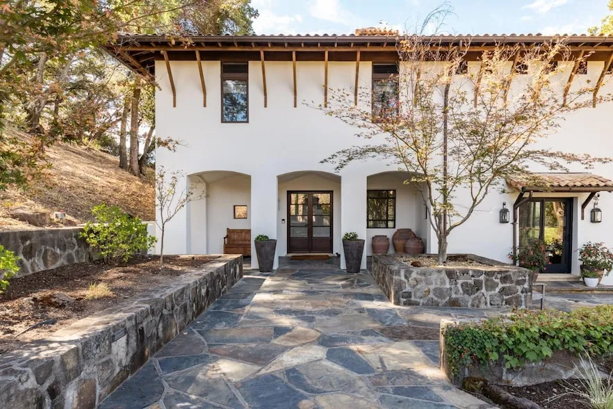 Nestled on a knoll just east of Silverado Trail and one mile from charming St. Helena, this modern Tuscan estate offers a unique blend of relaxed luxury, privacy and views. Sited on 4.4+/- acres and perched majestically above the Pope Street Bridge, this gated estate boasts sweeping views of the neighboring Napa Valley Reserve vineyards and hills beyond, while also offering incredible proximity to Meadowood Resort. Imported reclaimed materials and diverse design elements add to the charm of this exquisite property. Designed with a modern layout and aesthetic, the property includes a 2835+/- sf 3-bedroom main home, 850+/- sf 2-bedroom guest house with full kitchen, oversized wine cellar, plus a secondary wine cellar in the main dining room, and 1005+/- sf finished garage space. Standout features include reclaimed hardwood floors, handcrafted French made doors, large scale divided light windows, a gourmet kitchen, and temperature-controlled wine room. The second level primary suite offers an intimate setting, with private balcony overlooking the pool. Step outside to discover your own private oasis, with a dark bottom, heated, saltwater pool & water feature, raised stone gas fire pit, wood burning fireplace, expansive outdoor entertaining area, and cabernet vineyard.
