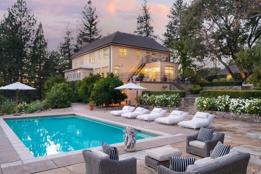 This custom well-built, French-inspired home overlooks Cade Vineyards and has ideal soils for planting a few acres of vineyard in the Howell Mountain AVA. Just 10 minutes from St. Helena and fully furnished, a buyer can move right in! The sprawling estate on 5 acres surrounded by renowned wineries and surrounded by lush greenery, features an elegant private drive, swimming pool, manicured gardens, and expansive patios. The 3-story home boasts a grand 2-story entry with a foyer that opens to a dramatic staircase to bedrooms, an elevator and leads into the Living Room and enclosed sun porch. The 3 car garage opens to the incredible wine cellar , media room, gym and access to the beautiful pool and gardens. The impeccable detail of the interiors features high ceilings and natural light. The Chef's Kitchen has timeless finishes and custom cabinetry and outfitted with high-end appliances, walk-in pantry, and a Breakfast Room. Upstairs the coffered ceiling Primary Suite has two generous walk-in closets and an expansive ensuite Bath. Three more guest Bedrooms, 2 Baths and Office adorn this floor. The detached Guest House has one Bedroom, 1.5 Baths, Living Room, Kitchen, and its own private Veranda.