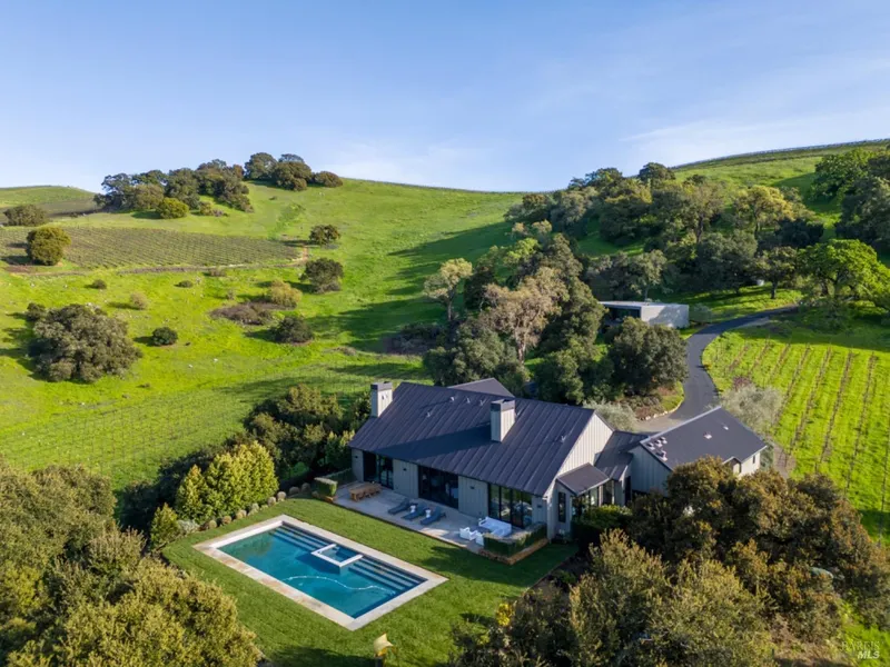 Serenely situated in the rolling hills of Napa, Oak Ranch sits on 12 acres laden with beautiful native oaks and has views from every vantage point over the positively breathtaking land and your own vineyard. The Hurley Hafen designed, custom single-level home, is a perfect antidote for those seeking privacy and calm. A seamless blend of indoor-outdoor spaces and natural light throughout both residences. The Chef's kitchen with great natural light, top of the line appliances and custom Imported Italian cabinetry abuts the secondary full kitchen, wine cellar, BBQ deck and a family room with a large banquette overlooking the pool. The primary suite has a Prada inspired closet and a private sun deck with outdoor shower and office off the spa like bathroom. The large media room, sun room, game room and 2 additional ensuite bedrooms complete this home. As you cross over the footbridge into the ADU- guest house you'll feel like your are in a tree house overlooking the Oak trees and valley below. Two spacious Ensuite guest rooms, nicely appointed guest kitchen and great room all flow to the cantilevered deck. The 2 car garage has a lift and storage space. Visiting the property will bring this serene, magical home filled with warmth and calm to life.