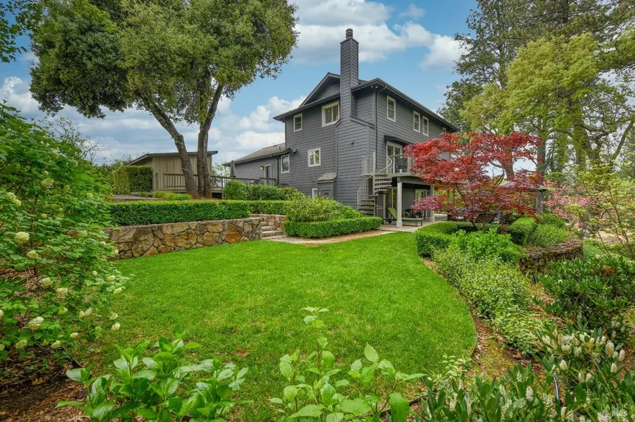Set on 1.77 acres of beautifully landscaped grounds just minutes from downtown St. Helena, this classic 4BD/3.5BA home offers timeless style, serene vineyard and hillside views, and thoughtfully designed spaces for relaxed Wine Country living. An updated chef's kitchen is a standout, featuring a 48'' Wolf range, KitchenAid refrigerator, Miele dishwasher, and marble/Caesarstone countertops. An open floor plan connects the kitchen to the spacious living room with linear gas fireplace, dining area, and family room opens to a generous deck ideal for al fresco dining and entertaining. Upstairs, you'll find three bedrooms and two full baths, including a luxurious primary suite with bath + ample closet space. Lower level offers a den, an office and a separate guest suite with its own patio-perfect for hosting guests or extended stay. The terraced garden, designed by Jack Chandler, features vibrant flowering plants, fruit trees, and there is a sunny area with raised beds for seasonal vegetables. Practical amenities include a 2-car garage, storage shed, central HVAC, a productive well, and PG&E generator hookups. Lots of hiking and biking trails nearby. This is a rare opportunity to enjoy privacy, nature, and functionality in one of Napa Valley's most beautiful settings.