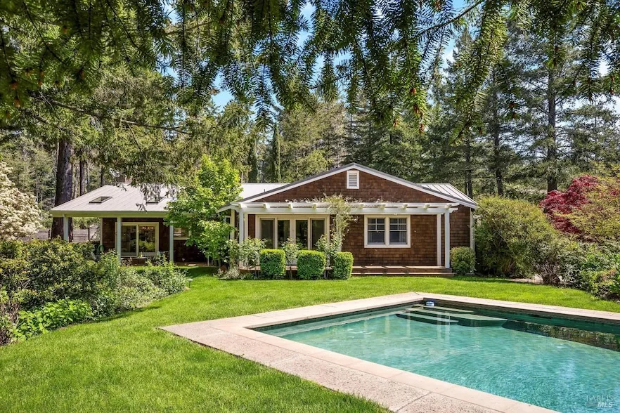 The tranquility of country living on 1.29 acre of beautiful mature gardens and the charm and comfort of a French Country home with guest cottage. The home is absolutely joyful with vaulted ceilings and skylights letting the sunshine in. The open floor plan allows you to move easily from living room with fireplace to the family room with a second fireplace. The family room is open to the dining area and kitchen creating a great room that opens out to the covered patio, the sparkling pool & spa, the expanse of lawn, the gardens and vineyard views beyond. The kitchen offers white marble counters and a gas cooktop range, built-in double ovens, custom cabinets, and enough storage to plan for a banquet! The primary suite also opens out to the pool and garden. The primary bath offers a huge walk-in shower and large tub. There is also a large office and wine storage. The grounds accommodate a separate guest studio, mature gardens, and landscaping, raised beds, and outbuildings.