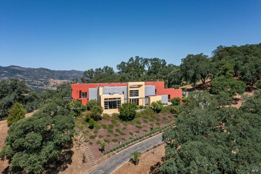 Located behind a main gate and a second private entrance, this stunning contemporary estate offers exceptional privacy on 61 acres just 30 minutes from downtown Napa and minutes from Lake Berryessa and renowned wineries. A landscaped driveway leads to a custom home with a three-car garage. At the entry, a koi pond welcomes you. Designed and built in 2007 by the Owner Architect, known for his work on Yerba Buena Gardens, Moscone Center, and Mission Bay, this home reflects a deep appreciation for the Napa lifestyle, fine dining, and world-class wine. The main level features a chef's kitchen with custom maple cabinetry, Thermador appliances, granite counters, island with prep sink, walk-in pantry, and bar with wine fridge. Enjoy views of Twin Sister Mountain from the wood-burning fireplace in the main living area. Upstairs, find an intimate sitting area with gas fireplace and an extra room ...