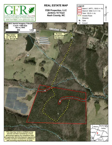 Research Parcel InformationFrom Nashville, NC/NC-64, Head north on NC-58 for 7 miles. Turn right onto West Castalia Road/NC-1425 and proceed for .7 miles. Continue down the access road for approximately .5 miles south before reaching the tract.