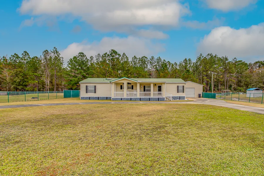 Immaculately maintained property pull up to an electric gate leading to a circular driveway into a fully fenced yard! Walk onto a 10x30 covered front porch, inside is a lovely open-concept spacious living area with wood burning fireplace, dining area, very large kitchen with island and a wetbar looking into the living-room area. Beautiful hard floors throughout all but 1 bedroom. Enjoy the back deck overlooking a private, scenic backyard with beautiful trees beyond the back fence - privacy galore. In the back is a large metal workshop with a carport, along with a shed covering the pump and aerator. Most amazing of all a 24x30 insulated garage with electric entrances at both ends, an 1800-lb built in safe that stays, and shelving galore! Security cameras convey with property.