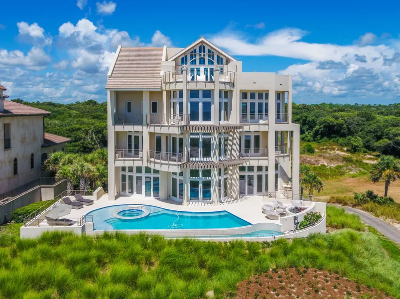 Located in the premier location on the most prestigious street on Amelia Island, this spectacular estate has unrivaled 270-degree views. The corner lot offers 100 feet of ocean frontage to the east and 150 feet of dune frontage to the north for ultimate privacy. Equipped with Miele/Sub-Zero appliances and Poggenpohl cabinets this fabulous "Chefs" kitchen flows into the dining, bar, and living areas, opening to an oceanfront infinity pool. The master suite & wellness spa (fitness room, steam room, and sauna) comprise the 4th level, all with spectacular ocean views. Special features include: 6,000 bottle wine cellar, commercial elevator, audio room, geothermal HVAC, and more. The first 2 levels are poured concrete and upper 3 levels are concrete block filled with concrete. All floors are poured concrete with steel tension cables. Located in the Amelia Island Plantation, a gated community with 24/7 privatesecurity. Walking distance to Amelia Island Club. Please visit www.43OceanClub.com for more details.