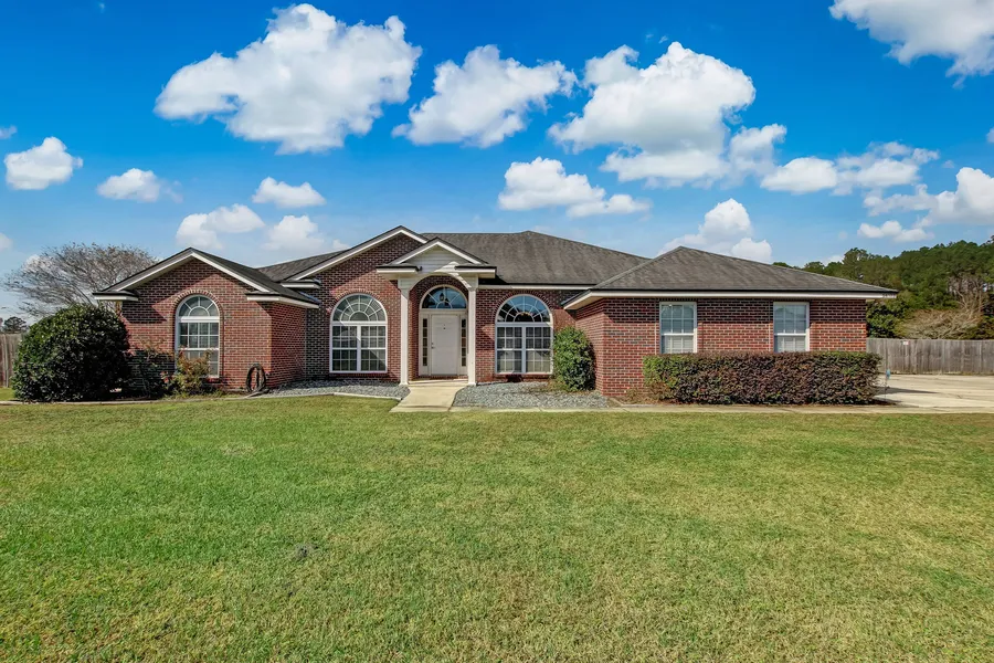 Unique layout all brick 5 bedroom/3 bath, 1.02 acre home located on a court, golf cart friendly neighborhood. Volume ceilings in every room. Formal dining room w/arched tinted window, kitchen has 42'' upper cabinets, brand new quartz lifetime warranty countertops and 2 pantries. Large indoor laundry room. Breakfast bar opens to the open concept family and living rooms. Master bedroom has ensuite, walkin closet w/organizers, 2 vanities, soaker tub and separate shower stall. Bedroom 2 has its own ensuite with automatic lights-on action. Bedroom 5 is used as an office with built in desk. Oversized screened porch overlooks fenced backyard, garden area, boardwalk to pool deck. Pool partially above ground, spans 3 to 6' deep, new pump '21, new liner '20. 12' x 22' detached metal shed. Attached 2 car garage. Expanded driveway. Surveillance system and motion lighting surrounds the house. New well, free flowing 200-300 ft, septic quick access lids. HVAC new 2020. Easy commute to 295/95.