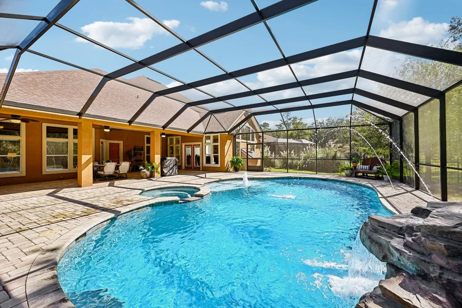 The ultimate Florida waterfront lifestyle is yours with this close to 5400 square foot pool home with dock on over 2 acres of land on Lofton Creek. Crafted in 2014, this home boasts 4 bedrooms, 4.5 baths and a new in 2023 oversized 8-foot-deep saltwater pool with hot tub and WIFI controlled LED water features including lighting and fountains. Enter the grounds by the long winding circular driveway, and drive into one of the three garages, taking time to notice the fountain, palm trees and feel yourself relax - you are home! Inside, you are greeted with a two-story entryway with travertine floors and a majestic stairway. Your kitchen is a chef's delight with custom cabinetry and a paneled SUBZERO refrigerator and Bosch appliances. The oversized great room with gas fireplace offers plenty of room for entertaining and cozy evenings. Needing a break - step out into the screened pool area to ...