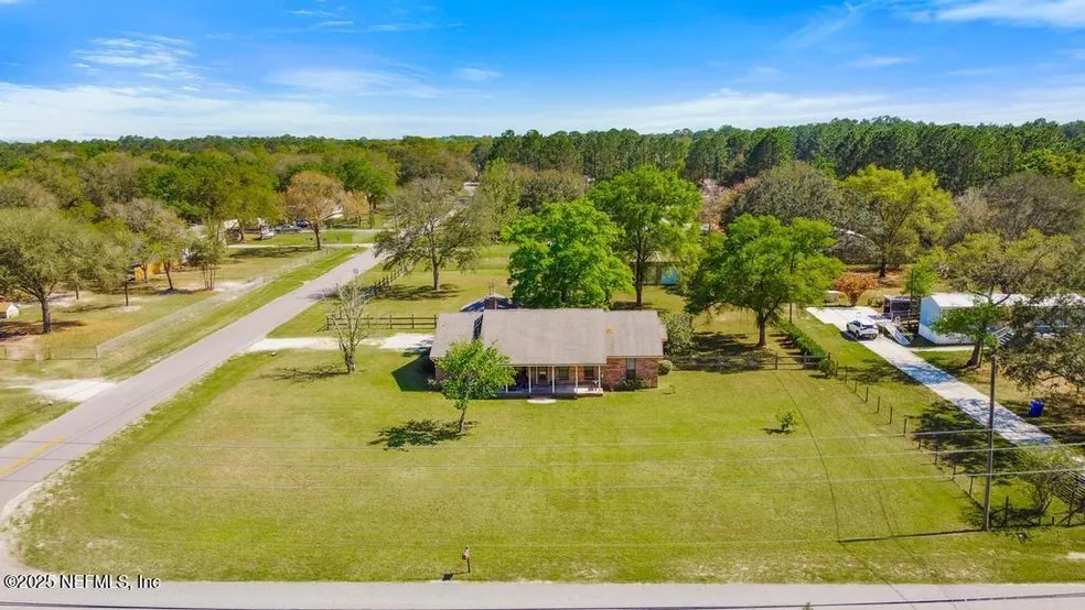 Timeless Brick Home on Over an Acre in the Heart of Yulee - No HOA, Endless Possibilities! Enjoy the freedom to create, expand, and enjoy all the space you need for your lifestyle. The fully fenced backyard is a blank slate for your future oasis, featuring a detached 2-bay aluminum garage (24' X 30'), perfect for extra storage, workshop space, or parking. Step inside to discover gorgeous wood and tile floors that flow throughout the entire home, adding warmth and character to every room. The massive kitchen offers plenty of counter space for meal prep, and is ready for all your culinary adventures. The wood-burning fireplace in the family room is the perfect centerpiece for cozy nights spent with loved ones, creating a welcoming atmosphere. This home also features a separate dining room that's perfect for entertaining or enjoying family meals in style. With a thoughtful layout, spacious rooms, and plenty of natural light, this property is truly a place to call home. Located just minutes from shops and restaurants in Yulee, and with easy access to Jacksonville via US-17, you'll enjoy both convenience and a peaceful country setting. Plus, a straight shot to Amelia Island means you're never far from the beach or charming downtown shopping. Relax on the front porch and imagine all the possibilities this beautiful property offers. Bring your Pinterest dreams to life and make this charming brick home yours today!
