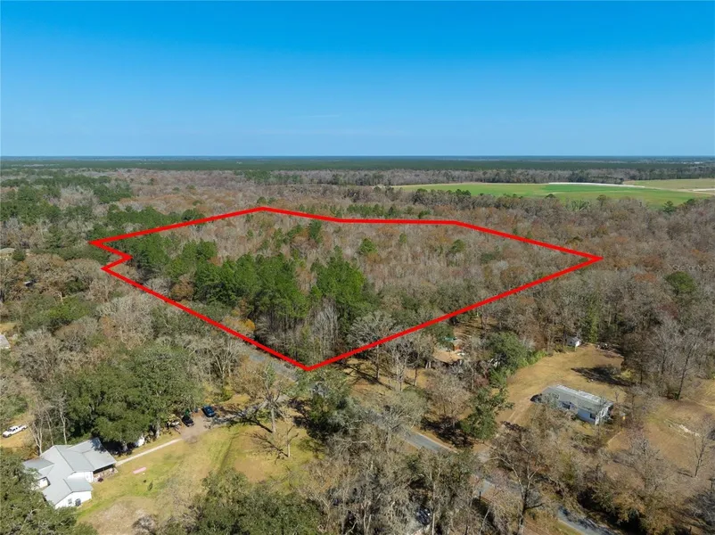 At the front of the property, a couple of natural water diversion streams guide surface water across the terrain, adding character and reflecting the land’s natural contours. At the rear boundary, the property borders Thomas Creek, offering a scenic and permanent natural edge with no rear neighbors. Beyond the creek area, cleared terrain appears to be used for agricultural purposes, creating a layered backdrop that enhances the sense of openness.