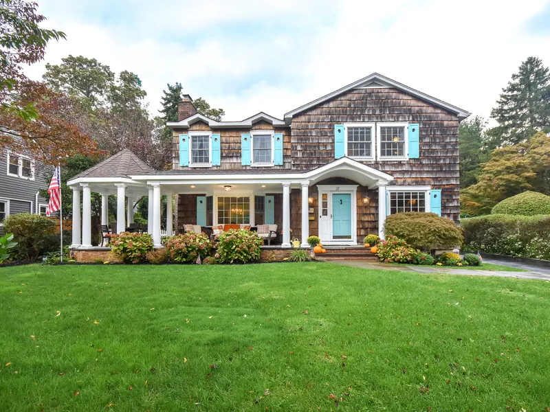 Quintessential All-American Uniquely Designed Front Porch Colonial. Sunny, inviting and warm 4 bedroom, 4 full bath center hall colonial located in Port Washington Estates with beach and mooring rights. Formal living room with wood burning fireplace, dining room, spacious eat-in-kitchen, family room with French doors and full bath. Second floor boasts a large master bedroom with cathedral ceiling, spacious master bath and 3 additional bedrooms and full bath. Gleaming hardwood floors. Legal full basement with playroom, full bath, home office, laundry room, pantry and ample closet space. Flagstone entertaining patio, detached garage, lush and private yard. Gas cooking/gas heat, sprinkler, alarm, close to town, train and schools. A gem!
