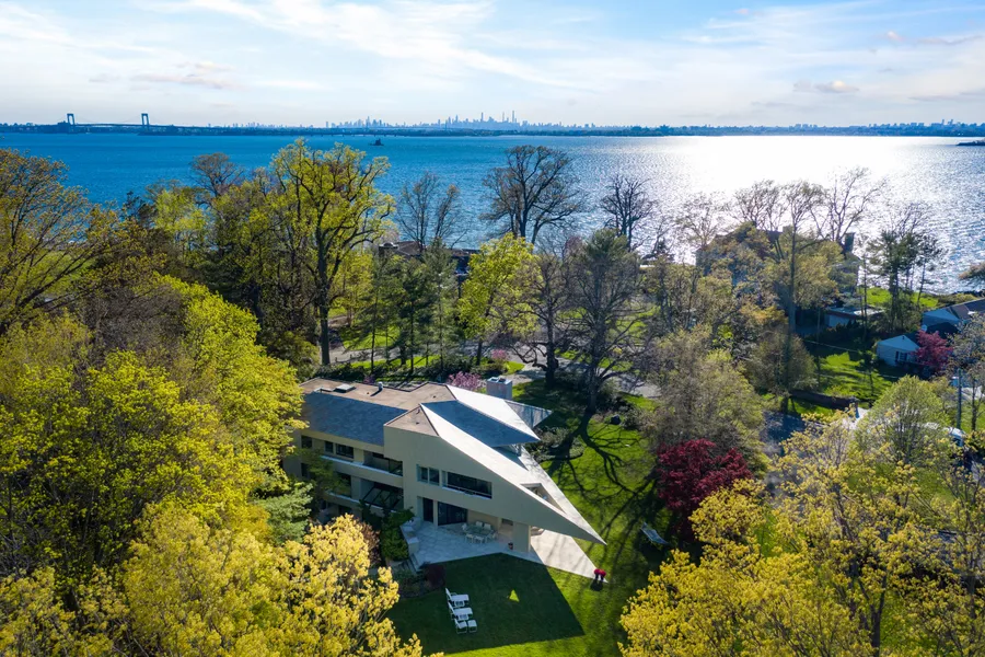Nestled at the end of a quiet cul-de-sac in Kings Point, 49 Pond Road is a stunning modern, contemporary residence custom built to emphasize exquisite views of the Long Island Sound and Manhattan Skyline. The exterior was designed using timeless materials featuring a cascading blue-slate roof while effortlessly integrating limestone and wood elements. The property boasts 1.3 acres; the majestic grounds have matured, colorful privacy plantings and sprawling flat lawn space. The yard includes a large stone entertaining patio, half-covered, with a built-in outdoor kitchen and a roomy storage shed. The residence comes with access to a private, sandy beach.