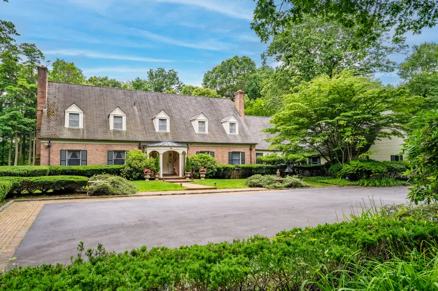 This Country Colonial is situated at the end of a scenic cul-de-sac. Highlights include a gated long drive detailed in Belgian block, 4.5 bathrooms, hardwood floors,and four fireplaces. Inviting large kitchen and den create a natural hub for the home. More formal entertaining can be enjoyed in the elegant living room and dining room. The sun room maximizes the use of light and space and offers a perfect setting to unwind and enjoy the view of the lush property. In addition there is a separate wing for long term guests. A verdant and lush property is surrounded by mature trees. Enjoy summer night around the sparkling in-ground pool. Four-car garage, loft, barn and storage shed.