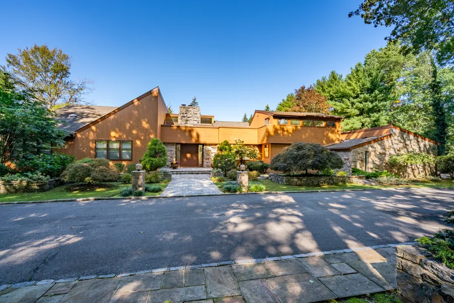 This cedar and stone home resonates a feeling of serenity, clarity and light as each and every window takes in the entire expanse of the landscape. Richly appointed with oak flooring, soaring ceilings, an open floor plan and walls of windows. The open layout features a dramatic great room, inviting den, formal dining room and a separate wing that's ideal for long term guests or a home remote office. Coveted main floor primary suite with three additional bedrooms on the second level and another on the main level. The two acre property boasts an entertainment complex with an inground pool, tennis court and an expansive patio surrounded by mature gardens. Generous cabana is ideal for summer entertaining. Golf, equestrian trails, the beach, the Tilles Center for the Performing Arts and the famed Americana shopping center are conveniently located nearby. Only 25 miles from NYC. Jericho SD.