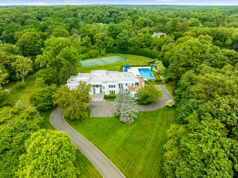 A unique opportunity to own a Timeless Modern seven-bedroom residence on a quiet cul-de-sac. The superior quality and workmanship abound with no detail overlooked. Generous rooms with soaring ceilings complement an open floor plan for entertaining. As you enter, your eyes behold a sunlit dramatic great room with a two storied windowed wall, fireplace and an immediate view of the remarkable property. An elegant dining room and two dens await your pleasure. Kitchen highlights include a generous center island, top appliances and breakfast nook. The coveted primary on the main level offers a dressing room, walk-in-closets and a luxurious en-suite bathroom. The second floor has four additional bedrooms and three full baths. Great vistas can be enjoyed on the second floor deck. The walk-out lower level boasts generational fun. State of the art home theater, billiard room, gym, recreational space set a relaxing tone for all. If the panoramic views weren't impressive enough, your oasis is set on 3.75 pastoral acres complete with a sparkling in-ground pool when you are ready to make a splash, tennis court, deck and patio. Generator. Three-car garage.