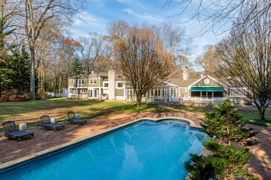 A beautiful shingled and stone farmhouse estate with elegant, updated high-end finishes, located in the heart of the Village of Brookville, New York. This stunning 8,000 +/- sq. ft. home seamlessly blends modern updates with its original character and charm. Situated on 2 manicured acres, this 7-bedroom, 7-bathroom refurbished residence boasts expansive entertaining rooms, vaulted ceilings, custom built-in cabinetry, hardwood floors throughout, and a professionally landscaped backyard with an in-ground pool and oversized brick patios.