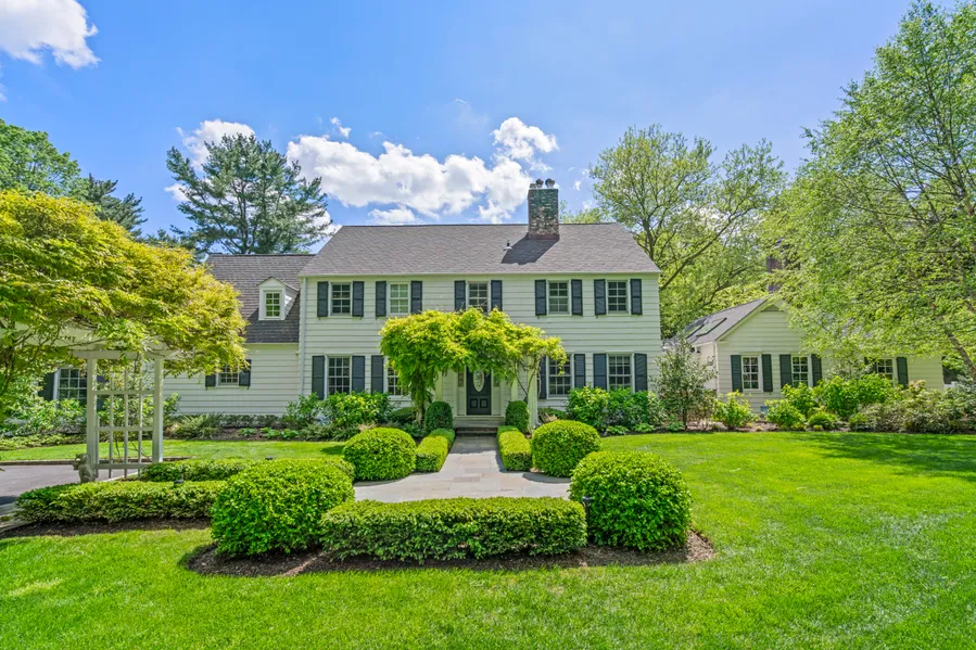 Welcoming gates and a long driveway open to this picturesque colonial set on 4.51 pastoral acres in Muttontown. This expansive 6-bedroom home and property has been renovated and maintained to perfection for today’s lifestyle. The entry foyer features wood floors with an attractive geometric pattern. Light-filled bay windows in the library, living and dining rooms overlook a delightful terrace, majestic trees, and sweeping grounds. Charming fireplaces anchor the living room, library, and home office/den with a wet bar. High-end artisan finishes adorn every wall. Cream cabinetry with a subtle glaze and Porcelanosa countertops accompanies new top-of-the-line appliances in the sizeable kitchen. A sunroom connects the living room and library where a secret door opens to a cabana/ bedroom with a full bath and additional access to the gardens. A white picket fence beautifully frames the newly renovated, sparkling gunite pool.