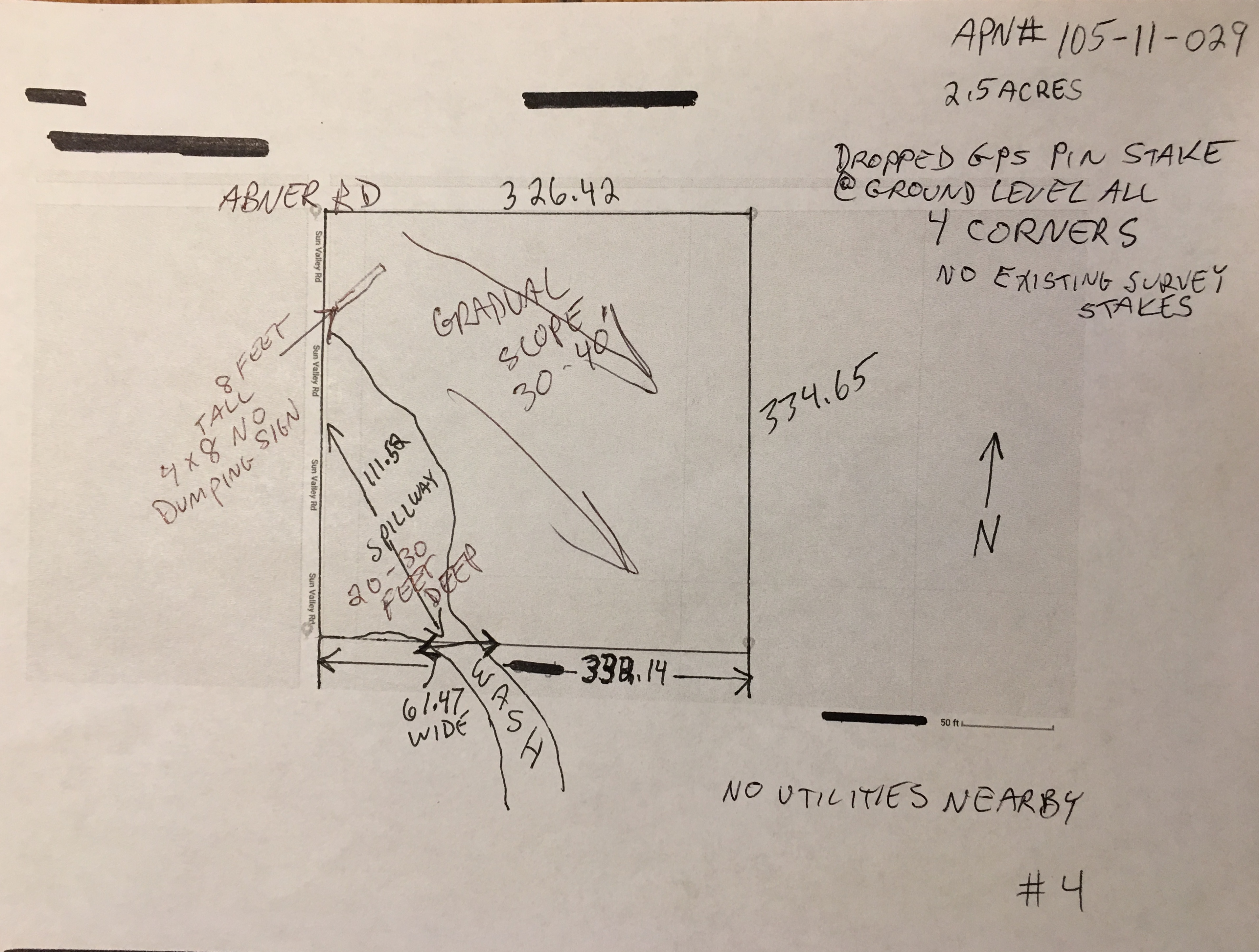 Abner Rd is an access road and it is a rough muddy and dirt road, Sun Valley Rd is a rough dirt and muddy road as well and has access to the northwest corner and Abner Rd only because of the wash that drops 20 to 30 feet off into the western edge of the parcel. The land slopes gradually 30 to 40 feet down from the northwest corner to the southeast corner, there is a 65 feet by 111.52 feet wash along the southwestern corner of the parcel that is a 20 to 30 feet straight down drop off that flows toward and through the center of the southern property line The ground is mainly dirt and sparse grassy areas with small shrubs and cacti. We placed GPS flags at all corners at ground level as there were no existing survey markers or pins.
