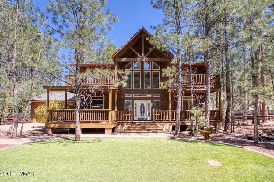 LISTED AT APPRAISED VALUE! Tucked beneath towering pines in the coveted Pinetop Country Club, this custom-crafted mountain retreat offers the perfect blend of rustic charm and modern comfort. Set on a beautifully landscaped and fully fenced 0.45-acre lot with gated entry and a pavered driveway, this 3-bedroom, 2.5-bath home welcomes you with dramatic woodwork, soaring ceilings, and walls of windows that flood the space with natural light. Inside, the great room features a stunning floor-to-ceiling stone fireplace, open loft, and an abundance of warm wood tones that create a cozy lodge-like atmosphere. The spacious kitchen boasts handcrafted cabinetry, tiled counters, a center island, and a breakfast bar perfect for entertaining. A large upper-level loft offers additional living or sleepin space, ideal for guests or a game room. Enjoy morning coffee or evening stargazing from your choice of four private decks, all surrounded by serene forest views. The oversized two-car garage, central vacuum system, and plenty of indoor and outdoor space add everyday convenience to this exceptional getaway. Located just a short distance to Jackson Lake and National Forest access, this home is an outdoor enthusiast's dream and a rare opportunity to own in one of Pinetop's most desirable areas.