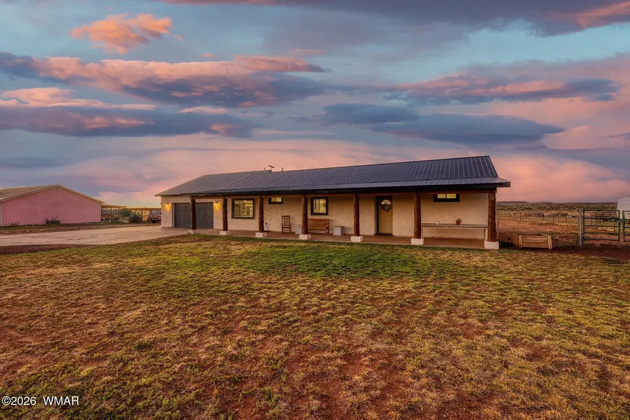 Welcome to peaceful small-town living! This move-in ready 3 bed 2 bath home sits on 1.18 acres of horse property with sunset views, full-length covered porches. Exterior features a newer metal roof, completely enclosed backyard Inside features vaulted ceilings, custom kitchen cabinetry, updated appliances, & a spacious primary suite with walk-in closet. Thoughtful touches include built-in bunk & loft beds, French doors, an outdoor-access laundry room with chalkboard wall, & a huge 25*8 storage room. The oversized 25*25 garage includes built-in shelving & a monitor for the hardwired security system. Fully fenced yard with 3 large gates, circular drive, RV parking with 2 hookups, apple trees, a rose bush, & Starlink internet. Country charm meets modern convenience. Your dream home is ready