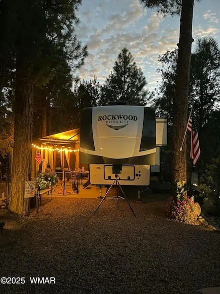 Full-time RV lot WITH 37' RV has full hook-ups and in a perfect location within the beautiful White Mountain Vacation Village (WMVV). (The Lot and RV can be sold separately)This lot has plenty of room for your RV with an additional parking space for a vehicle. The corner lot location allows very easy access for both your RV and vehicle. The lot includes a cement pad on the door side and a nice secure storage shed. With party lights and outdoor furniture included you're ready for fun and relaxation within minutes of pulling in! WMVV is a great destination with towering ponderosa pine trees and forest feel, yet located very near all amenities, medical facilities, and loads of outdoor fun. With the mobility of an RV there's no excuse for enduring another brutal summer in the desert!