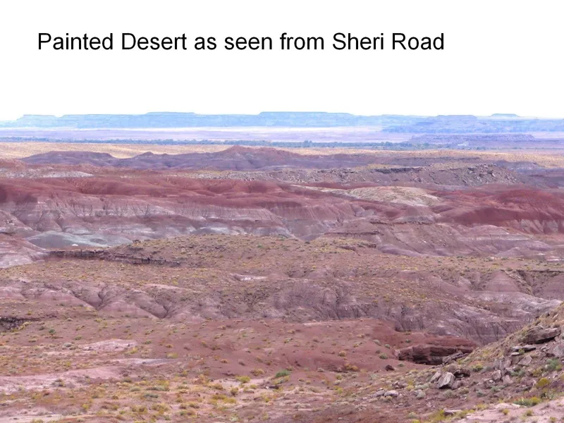 This property is in the northernmost part of the subdivision and is in a beautiful undeveloped area. When you look to the east you are looking straight into the Painted Desert and the Petrified Forest National Park with all of its glorious rock formations pointing skyward. From here you can look to the south with views that must be 100 miles or more. The same mineralization that makes up the National Park starts a couple hundred feet east of Sheri Road and runs from I-40 up to just south of Wild Horse Trail. It is an incredible view. From Sheri Road you can walk the couple hundred feet right up to the edge of it and look down and over it all. To the north you can see clear up into the Navajo Nation with its gorgeous rows of colorful mountain ranges. The area has scattered sagebrush, native grasses and massive green meadows that go forever with spectacular rock formations jutting up from the green floor. It looks like a stagecoach should be going by any time.